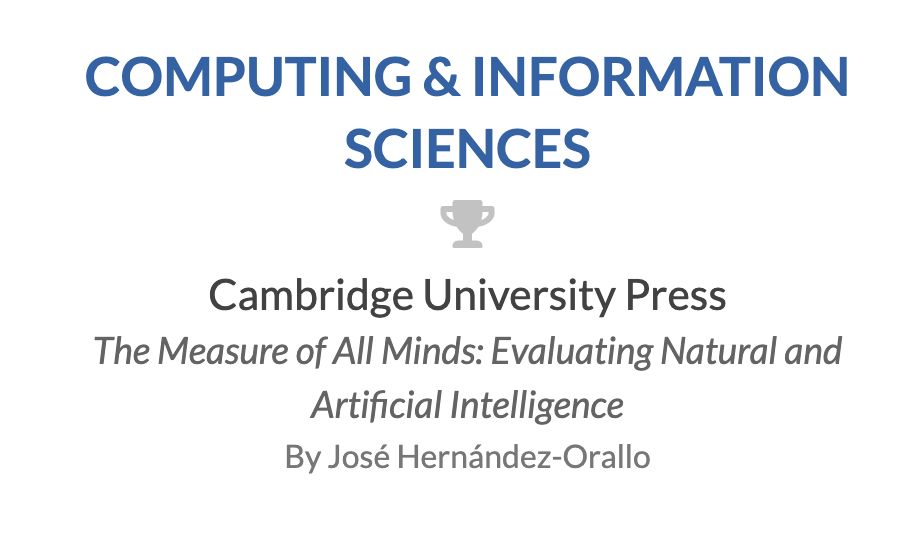 José Hernández-Orallo received the Prose Award 2018 presented by the Association of American Publishers for his book "The Measure of All Minds"